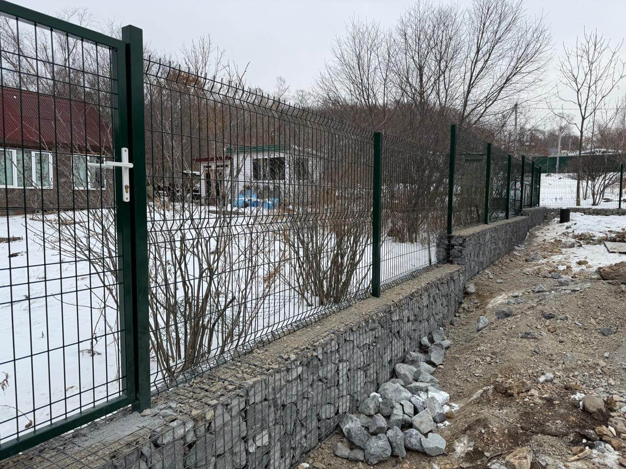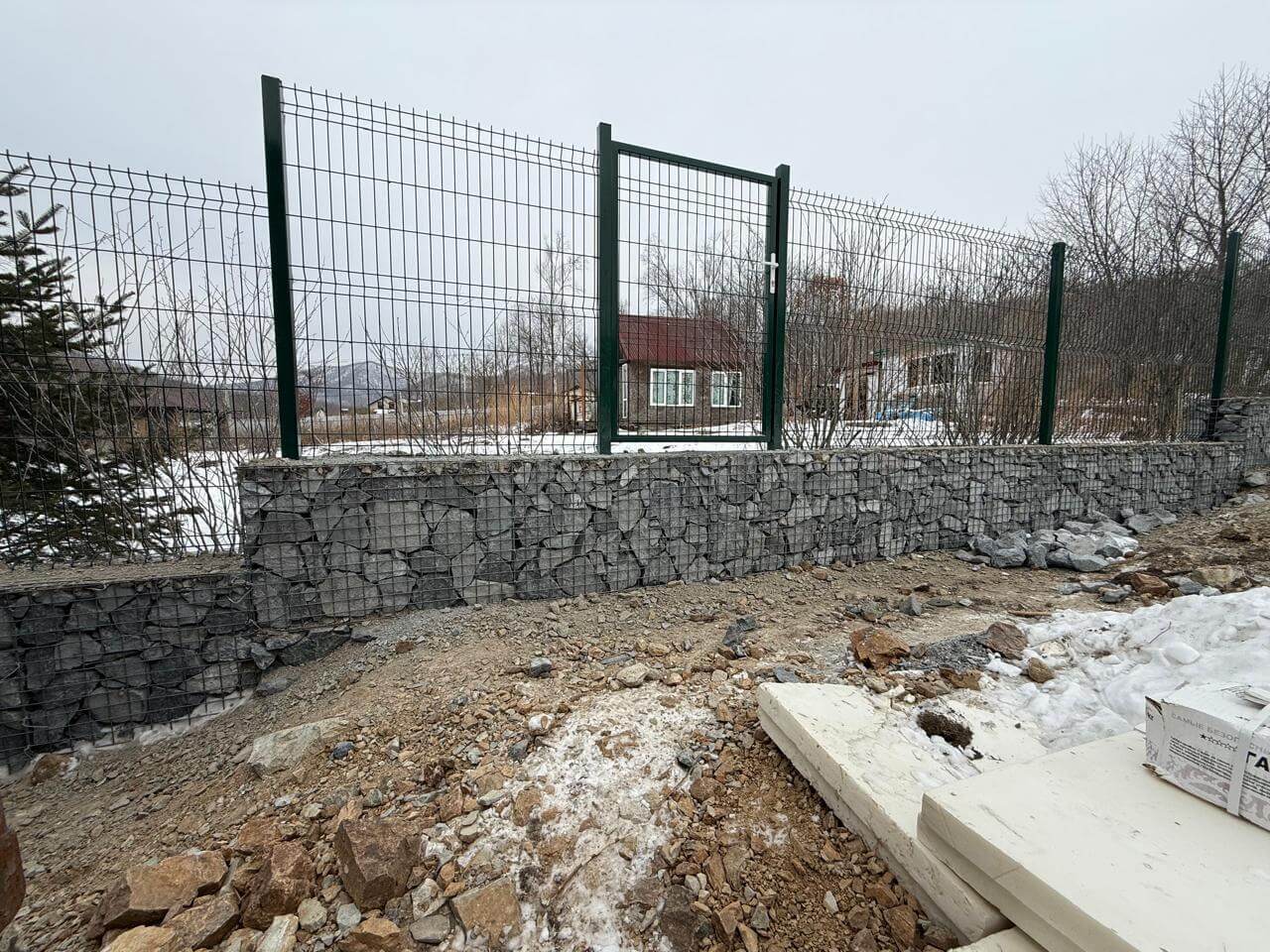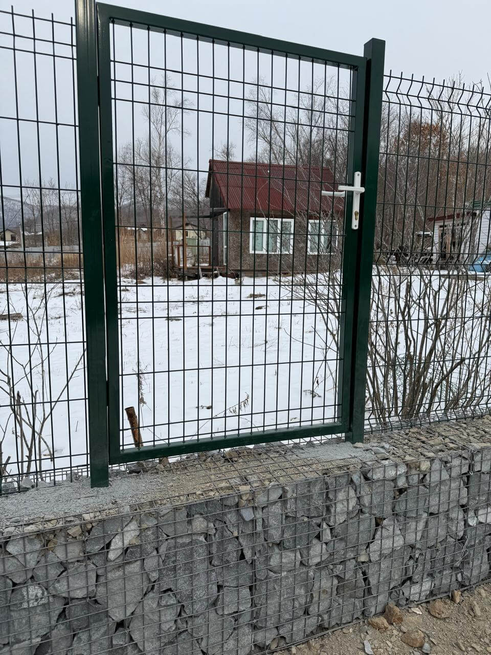 Установить забор из 3Д панелей с учетом 1-й калитки, высотой 1500 мм с применением прутка 5 мм. Монтаж забора выполнить на основание из габионов размерами 2000*400*700 с использованием сварной сетки диаметр предка 4 мм.
