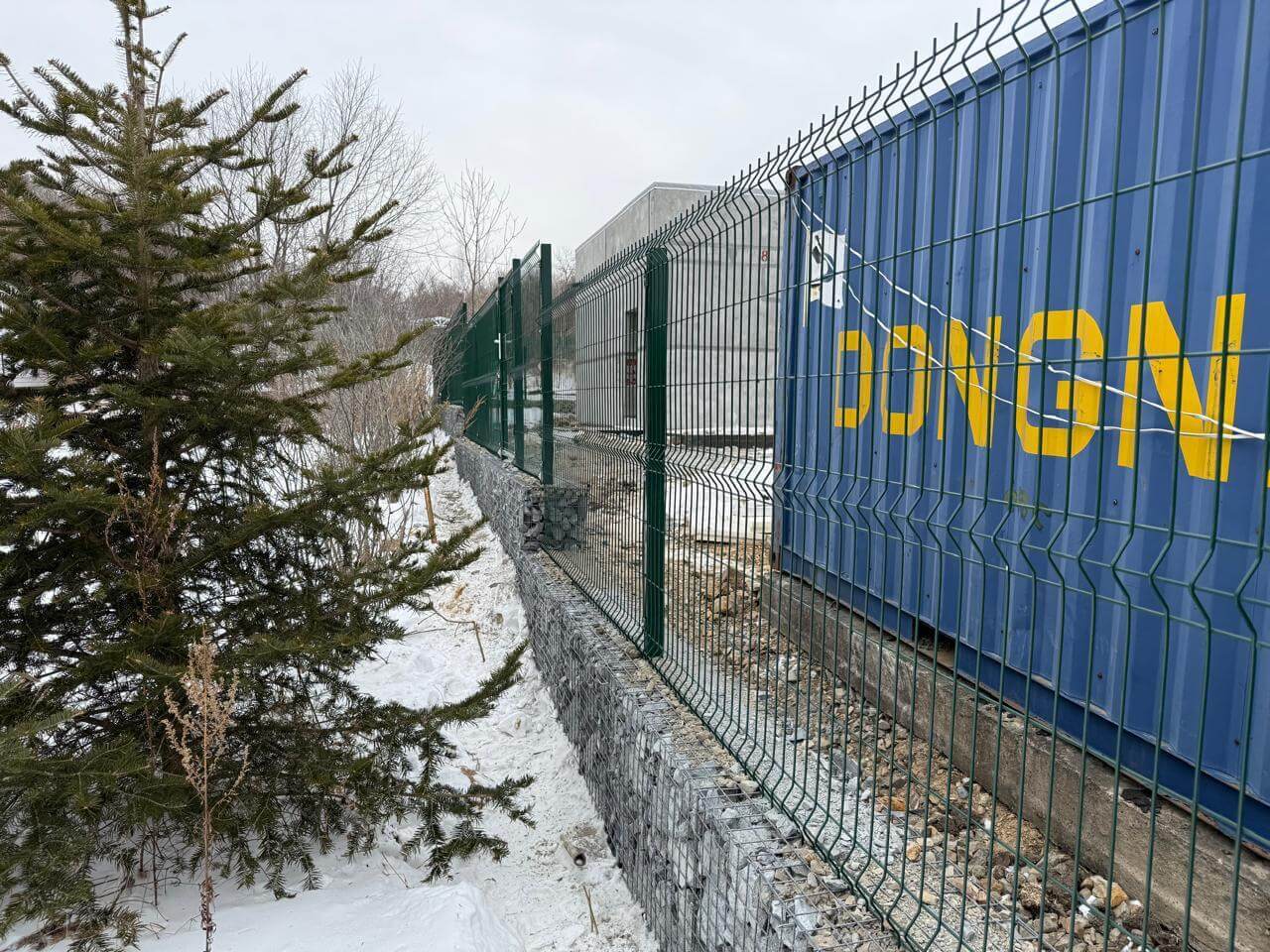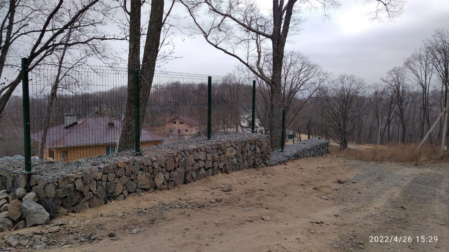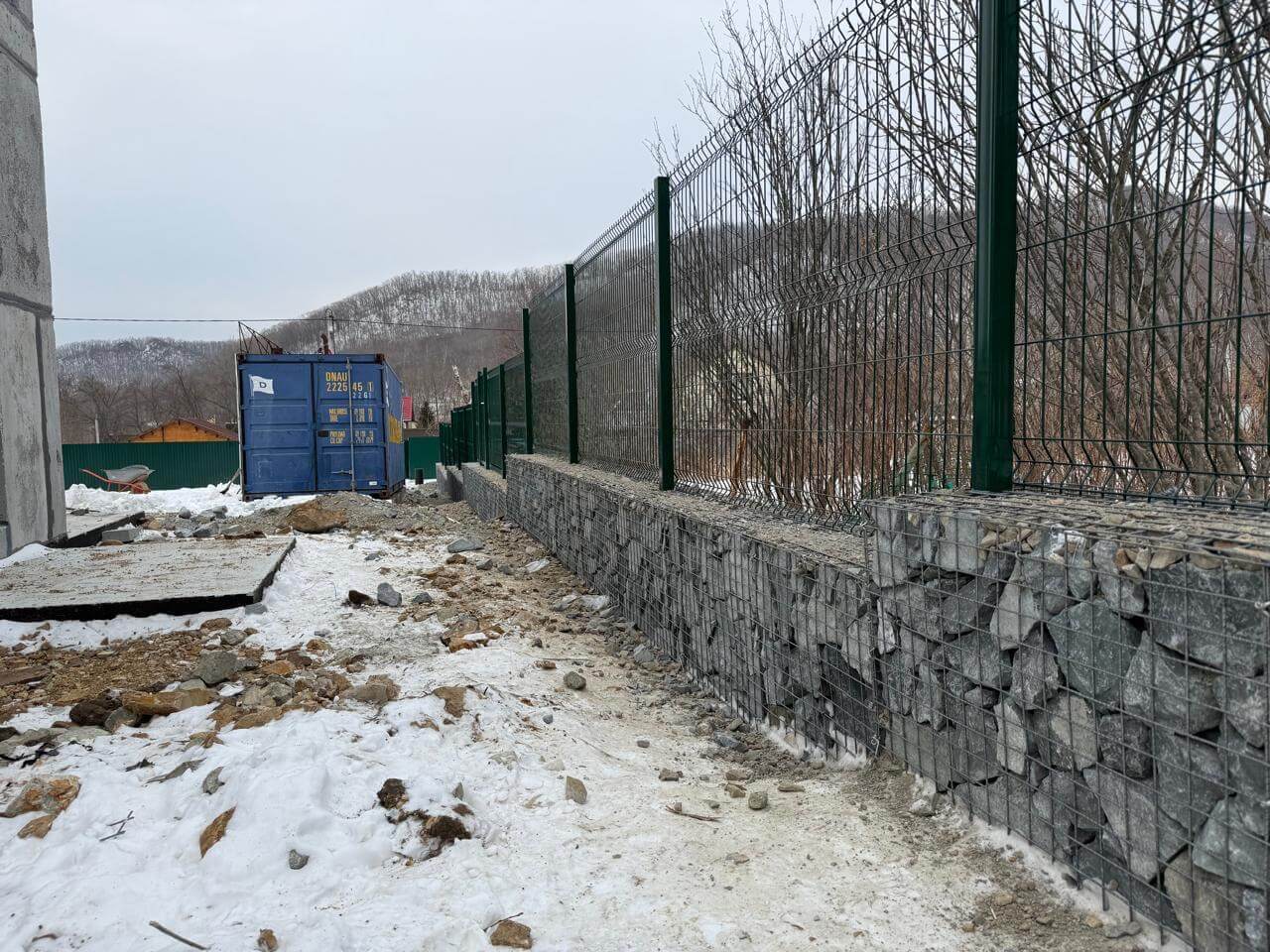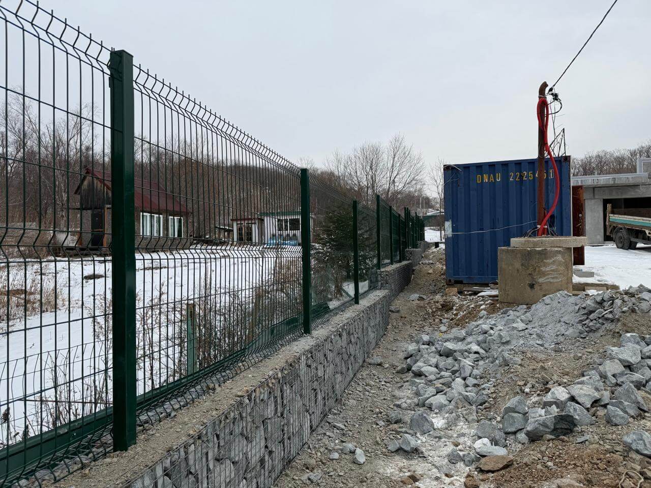 Установить забор из 3Д панелей с учетом 1-й калитки, высотой 1500 мм с применением прутка 5 мм. Монтаж забора выполнить на основание из габионов размерами 2000*400*700 с использованием сварной сетки диаметр предка 4 мм.