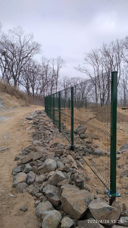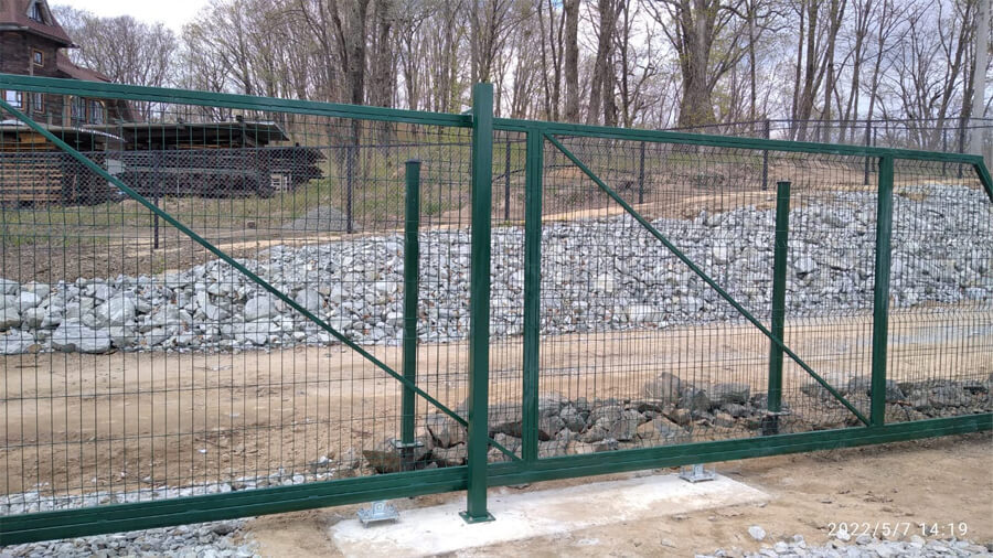Изготовить забор 3D, ворота зеленого цвета, высотой 1,5 метра с диаметром прудка 4 мм. Монтаж забора 3D, монтаж габионов.